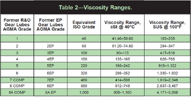Outra boa fonte para determinar a viscosidade apropriada para um tipo específico de redutor industrial é o padrão AGMA 9005-E02 “Industrial Gear Lubrication” (anteriormente AGMA-D94). A norma AGMA 9005-E02 mostra graus de viscosidade sugeridos para redutores industriais operando sob cargas normais em uma faixa de velocidades e temperaturas ambientes.